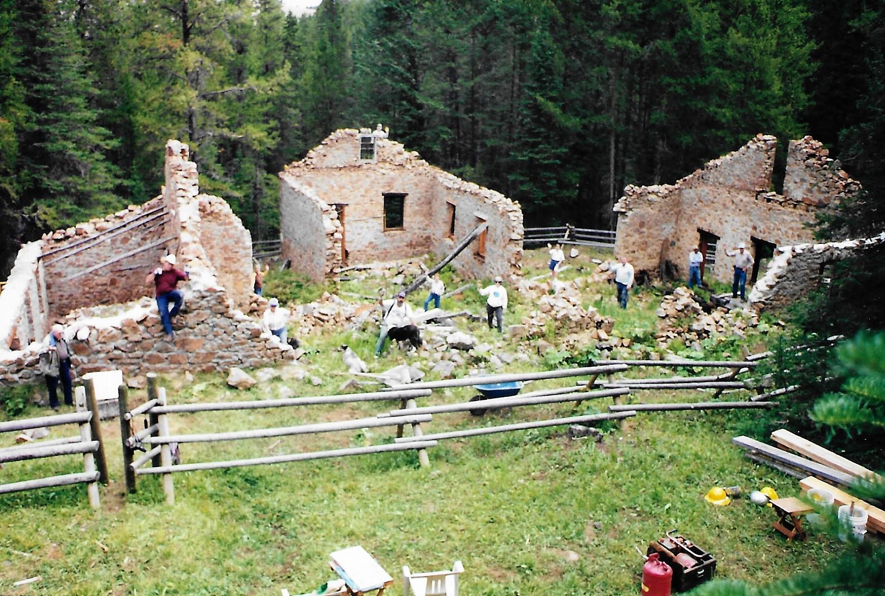 The Christenot family, along with friends of the Christenot Mill, have helped the BLM with stabilization projects at annual work parties. New windows frames and doorways are allowed to be added to help stabilize the remaining walls. These have been hewn by talented family carpenters over the years. Masonry has been added or reinforced to help with the wall strength and preservation. Wooden remains have been treated with chemical preservative, and brush and small trees are removed.